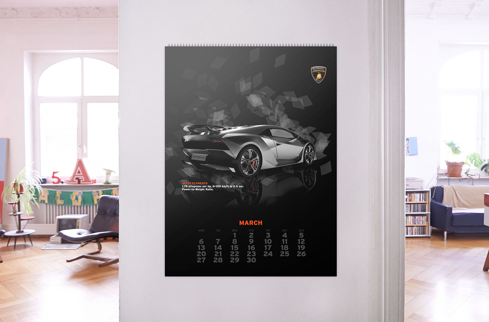 Bei Lamborghini wurde bisher immer das extrem Sportliche in den Vordergrund gestellt. Kompromisslos, extrem und italienisch sind die Begriffe, die Lamborghinis Markenwerte wohl am besten beschreiben. Die Marke soll jederzeit im Einklang mit dem Produkt und den dazugehörigen Kommunikationsaktivitäten stehen. Gleichzeitig steht Lamborghini aber auch für Kontinuität in der Markenführung und der Ausstattung der Kommunikationsaktivitäten. So auch der alljährlich erscheinende Kalender, in der Ausführung als Wand- sowie Schreibtischkalender, den wir für Lamborghini entwerfen durften.
